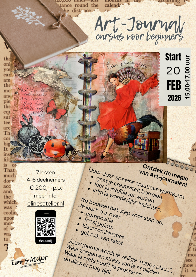 Deze beginnerscursus bouwt het art-journalen stap voor stap op. We starten met de meest eenvoudige materialen en elke les komt er een techniek bij. Je leert iets over kleurcombinaties, compositie en focal points. Je ontdekt zo vanzelf wat bij jou past.